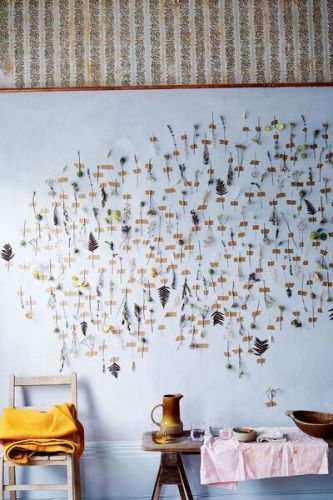 This flower wall is made up of dried materials, so after the dinner party or gathering is over there is no rush to take it down. Plus, there’s the bonus of not having to work in straight lines. Picture: Kristin Perers