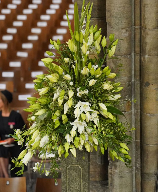 Inside Westminster Abbey, the floral displays were a more subtle white and green—though subtle only in color. These huge arrangements contained asiatic lilies, gladioli, alstroemeria, eustoma, foliage of English oak, weeping birch, sprigs of myrtle, and lily of the valley, according to the Guardian.