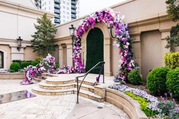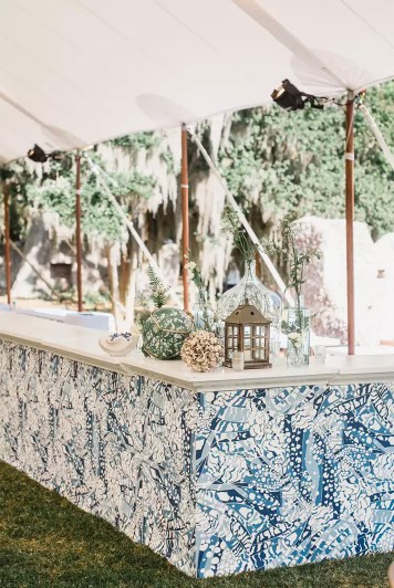 To bring these hues to your event, deck out your site with greenery embedded with blue and white flowers. In addition to your typical arrangements, like aisle installations and reception centerpieces, you can also go bold with flower chandeliers. Gorman also suggests working sage into your bridesmaids’ attire. Then, implement blue and white prints, whether it’s the linens, the chargers, the bar design, or all of the above. To complement the colors and the venue, Gorman suggests incorporating texture, like rattan. Perhaps you suspend rattan lanterns above your tablescapes, or maybe you fill rattan baskets with blooms to place at the entrance of your tented reception.