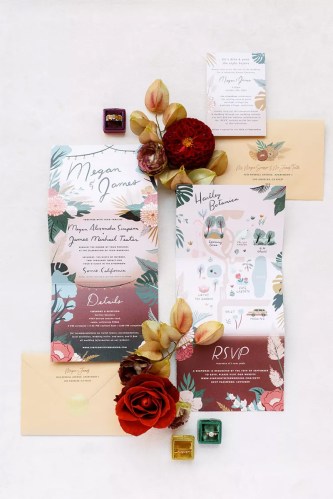 Since these bold tones are found in the natural landscape surrounding your vow exchange, using burgundy and orange flowers and leaves is a seamless way to integrate these colors into your design. While you walk down the aisle, carry a bouquet of foliage, anemones, roses, and cosmos in orange and burgundy before reciting your promises in front of an arch composed of the same blossoms. You can also implement seasonal arrangements of the same colored blooms to accent the seating chart, bar, dinner tables, and cake display. You can either use these hues in tandem, supplement the two tones with gold, or balance out the color-focused look with white.