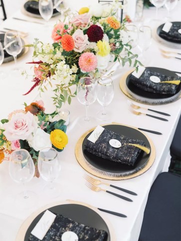 Wondering how to make this unexpected array of colors work for your September affair? Focus on vivacious floral arrangements that showcase berry, butterscotch, tangerine, and ivory. Then, implement darker details for juxtaposition. For instance, line white tables with clusters of colorful flowers, and choose black chargers, black napkins, and black flatware with a touch of gold to welcome an interesting contrast.