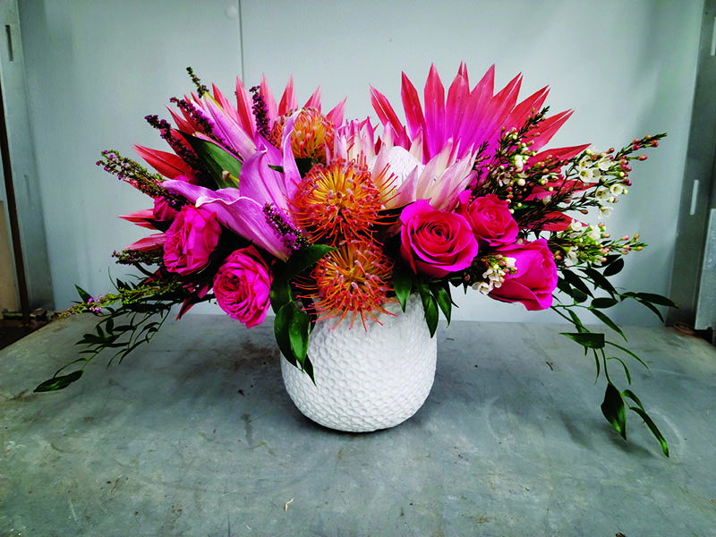 Anna Day, AIFD, CFD, is a talented freelance floral designer and owner of Anna Day Designs, in Mesa, Ariz. Her bold arrangements, exclusively created in containers from Accent Décor, feature hot-pink-tinted fan palms and colorful lines created with Midollino Sticks sheltering king Protea and pincushions, along with garden roses in a range of pink hues, Cymbidium orchids, Anthurium and hybrid lilies.