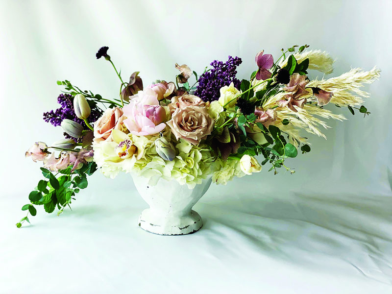 Jaime Webber is the “forerunner of all designs” and owner of Roanoke, Texas-based The Floral Bar, a community-based flower shop specializing in weekly arrangements; weddings; and intimate floral design workshops—or, as Webber calls them, monthly “craft nights,” with wine, flowers and friends. Webber brings 23 years of experience in creating with color and texture, which is aptly seen in these sophisticated designs featuring muted tones with natural pampas grass and white Hydrangea, with subtle pops of colored roses, peonies, Cymbidium orchids and other boutique blooms.