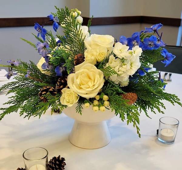 Because white is part of the tradition and reflects purity, as well, white roses, Hydrangea, snapdragons, daisies and the ubiquitous poinsettias are also useful to include, and white can be the dominant color, if needed. Plus, white mixes so well with pine flourishes.