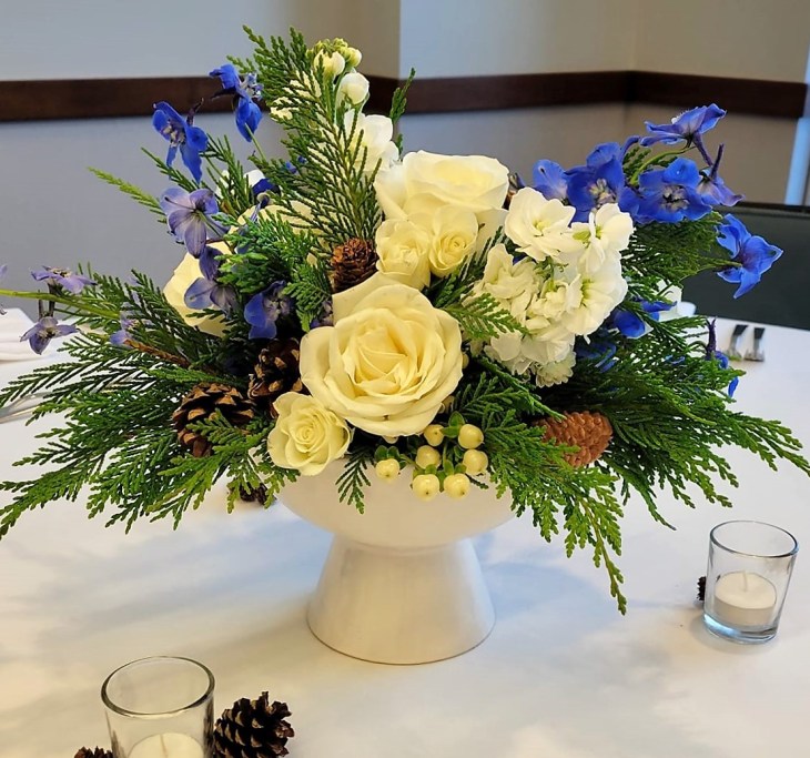 The traditional colors for Chanukah are blue and white, the colors of the flag of Israel. Of course, the question then is, “Why blue?” It’s the color the Israelites were told to dye the thread (tekhelet) on the knotted fringes of their prayer shawls made with ink from sea snails. You can find many ways to create holiday centerpieces using these colors that won’t clash with your clients’ décor. Perhaps make it a complementary color and find various shades to include the blue theme.