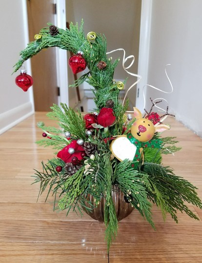 A fun winter holiday trend that is still going strong are Grinch trees (a.k.a. Grouch trees, Grump trees, Whoville trees). Remember the tree in the book and movie How the Grinch Stole Christmas? Grinch trees can be either miniature potted trees or designs of fresh cut evergreens—often cedar or cypress—bound with twine or decorative wire, with the tops curving to one side and an ornament dangling from the downward-facing curved tops. These clever designs are perfect for office desks, kitchen counters, bathrooms and other tight or crowded spaces, and they can be customized with fresh flowers in water tubes and tinted in a rainbow of fun, bright hues. Sure to stop traffic and cause conversation, Grinch trees will bring laughter and fun into any environment.