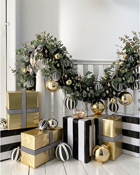 In this look, displayed fabulously interpreted by U.K.-based florist David Lawson, holiday celebrations will be brought alive using high contrasting black-and-white hard goods such as ornaments, votives and tableware anchored by an equal measure sophisticated greenery, white lights and gold luster. It is essential to the look that you first lay the groundwork of a well-formed natural looking display, including illuminations for that extra sparkle, before enhancing with the contemporary pizzazz on black-and-white stripes, checks and other patterns. Finally, supplement with bold gold balls, ribbons and packages.