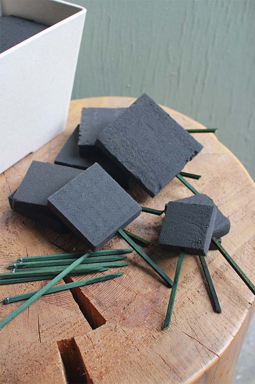 Cut a second brick of dry OASIS® Midnight Floral Foam into thin squares (12 to 15), of varying sizes. Insert a wood pick into the center of one edge of each square.
