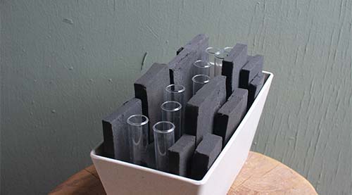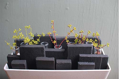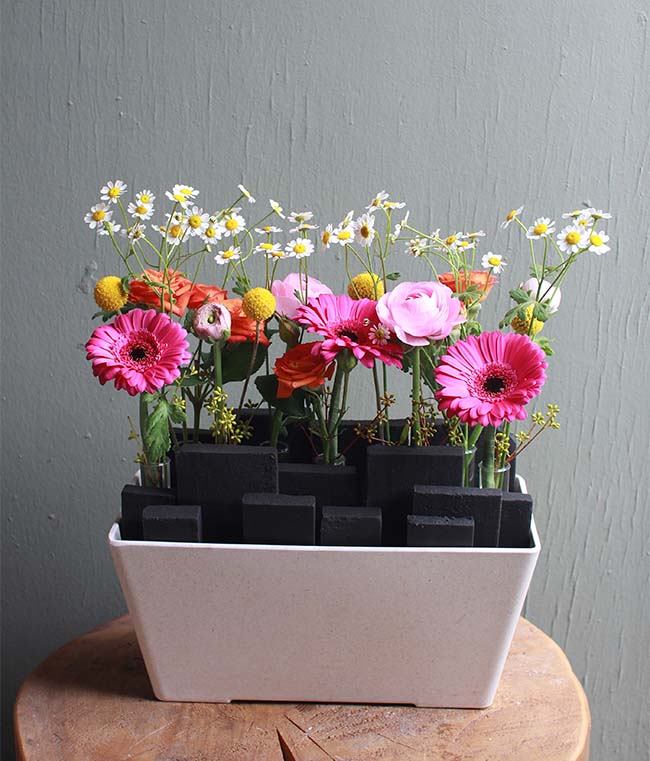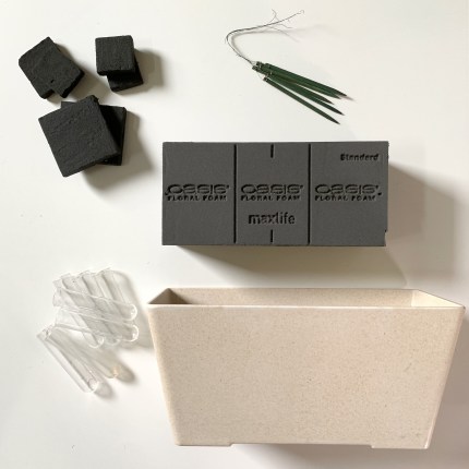 Insert the wood pick in each floral-foam square into the floral foam in the container, to create a multiheight, multidimensional series of “walls.” Leave space between the “back wall” of floral-foam squares and the more forward “walls,” to accommodate the placement of water tubes.