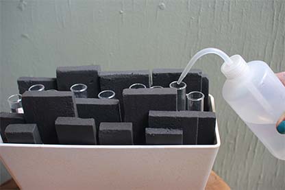 Insert eight to 10 4-inch water tubes vertically into the floral foam in the container, in front of the “back wall” of floral-foam squares.