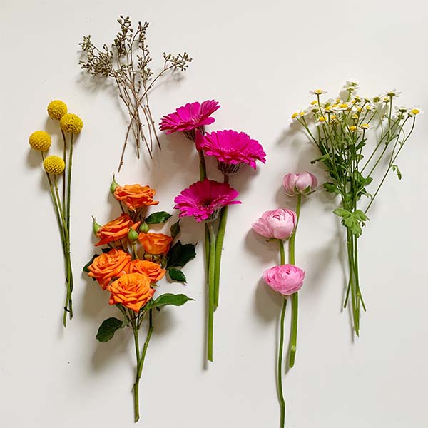 Arrange stems of billy buttons, spray roses, miniature Gerbera and Ranunculus into the water tubes at approximately the same height, just above the sprigs of seeded Eucalyptus. Then arrange stems of chamomile daisies slightly higher than the other botanicals. The overall effect should be that of a terraced rock-wall garden.