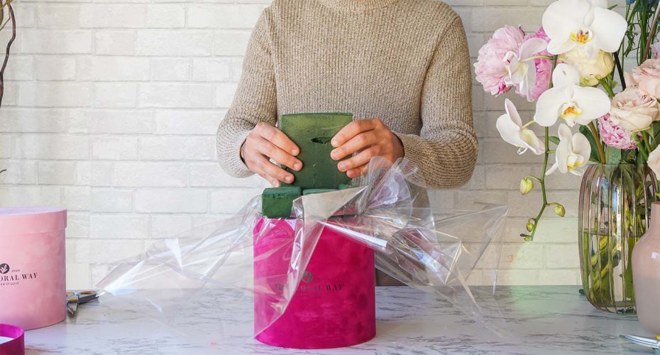 Soak several pieces of floral foam in properly proportioned flower-food solution, and place them into the lined container. Add more flower-food solution into the container.