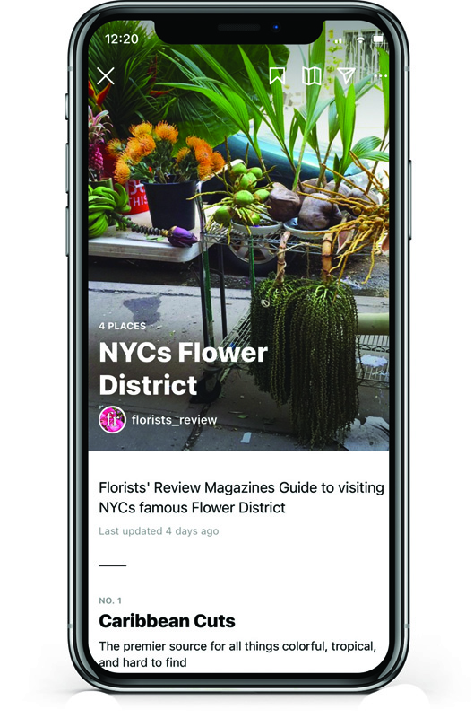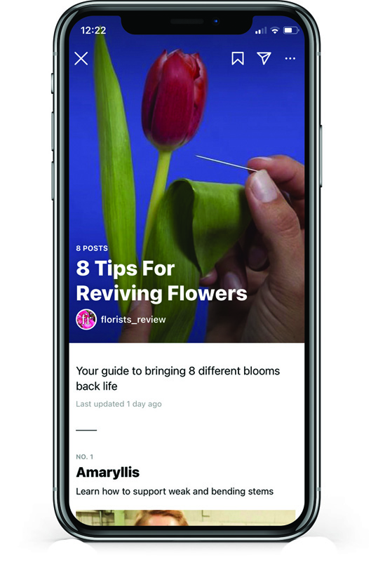 Take control of customer satisfaction by creating a “Posts” Guide highlighting your favor- ite flower-care-themed posts. As florists, we all know the vital role that proper care and handling plays in ensuring that our blooms last as long as possible, but passing on this important knowledge to customers is not always so easy. Teach your customers about using clean vases, trimming stems, using flower nutrient solution and changing it often, and more, without ever lifting a finger to create a photo or video of your own. To highlight expert flower-care advice, start by hitting the “Save” bookmark icon on posts themed to keeping flowers fresh, then collect into a flower-care Guide. Pro Tip: Visit the profiles of your favorite flower-care product pages, such as Chrysal USA and FloraLife, to find picture-perfect posts on this topic already made and ready to share.