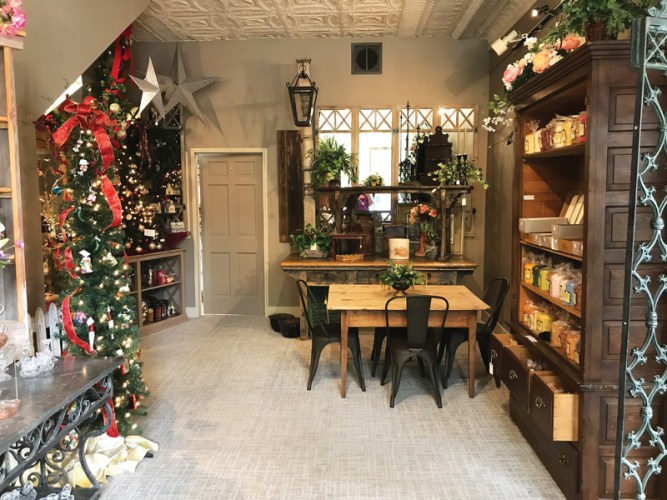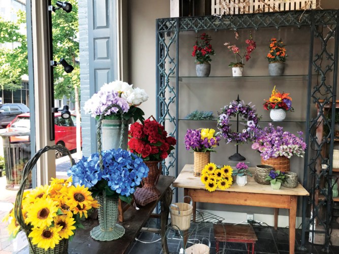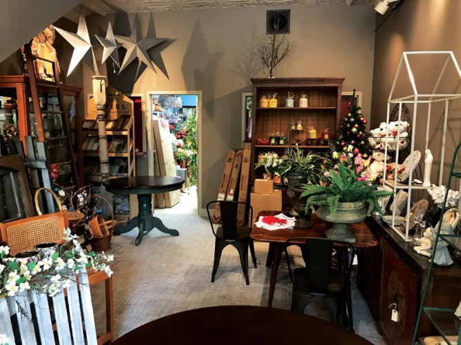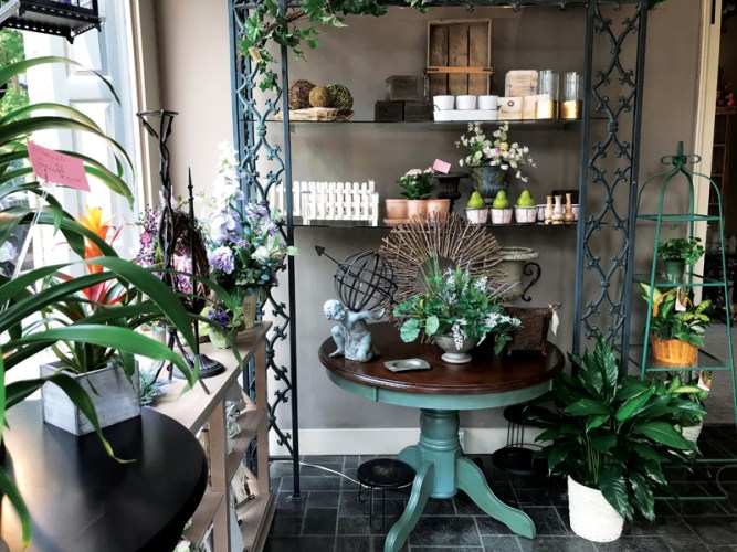The store combines traditional floristry along with vintage/antique furnishings and other items. The store has a historic downtown location in a college town, the perfect combination for an updated use of space and merchandising.