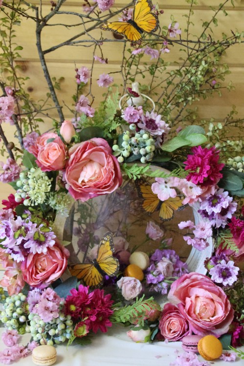 This everlasting Mother’s Day piece was inspired by the circular shape of the lantern: a wreath of permanent botanicals that can be used as home décor through both spring and summer seasons. For this presentation, I also incorporated fresh cherry blossoms and Pittosporum, and inside the lantern, I created a small arrangement of fresh edible flowers as a holder for the macarons. My final touch was monarch butterflies, which remind me of my mother and provide a wonderful a pop of contrast to the pastel florals.