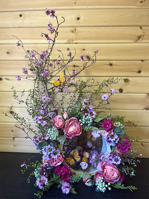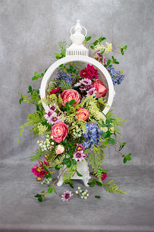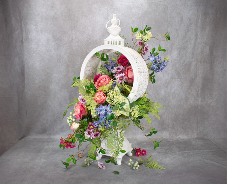 The inspiration for this design was a focal piece for mom to display on her vintage buffet. Once I saw the spacious lantern, I knew I wanted to create a multidimensional arrangement that cascades out from inside the lantern and from front to back; therefore, I chose not to use the glass inserts. I also wanted to elevate the lantern to allow more space for the flowers to drape, so I attached it to the top of a candlestick. I painted both the lantern and the candlestick to look like one cohesive piece. I was allowed to incorporate other permanent botanicals, so I chose blue French lilacs with pink and lavender veining, which pull the colors of the other flowers together nicely, and a bonsai Ficus branch, for movement and texture.