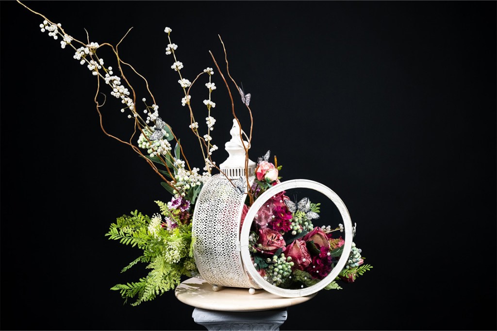The three finalists featured on these pages were invited to create an imaginative design to honor a mother on Mother’s Day, highlighting an everlasting gift generously provided by our sponsor, Melrose International. Each semifinalist received a stunning circular lantern and a variety of permanent botanicals with which to create their designs.