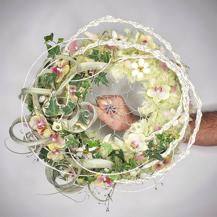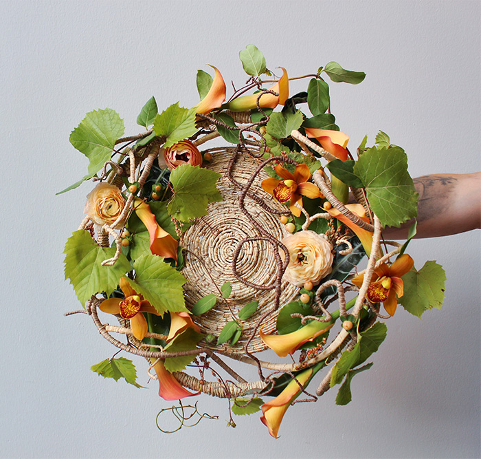 For more aesthetically inclined couples, the bouquet can be an artistic expression, resembling a modern art piece. Former sculptor turned floral artist Matthew Blind, of Coach Blind Florals in St Louis, Mo., designs bouquets with unconventional materials, weaving and crafting everyday objects into stunningly intricate creations. “It’s important to not confine yourself to exclusively floral elements when crafting a bouquet,” explains Blind. “You can draw inspiration from the world around you, creating unexpected armatures from any assortment of items. This allows you to create an even more custom arrangement, responding both to the world around you and things important to your clients,” he adds. Binding together these unexpected elements with coated bind wire is an elegant solution to visible mechanics. You can play around with mechanics and experiment with new ways to build an armature—the sky is the limit.