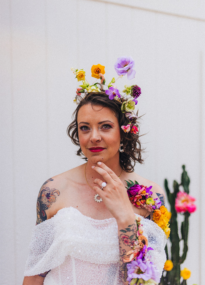 People throughout history and across cultures have adorned themselves with flowers as a form of expression. In the wedding world, the bohemian flower crown trend ruled the scene in the 1960s and 70s, later experiencing a revival in the mid-2000s. In recent years, we’ve seen an explosion of creativity surrounding how and where to wear flowers. From floral dresses and veils to modern takes on the flower crown (including a stunning flower-adorned afro, as seen in the design by Meghan Campbell, of Twisted Bramble in Seattle) to bridal bouquet boas (as seen in the example by Greenville, S.C-based Hey Jude Florals), wearables are truly having their moment. “There is a magic to wearing flowers, by embodying them you become part of the arrangement,” explains Bethany Steinhauser, a wearable floral artist in Las Vegas. “Wearables are a great way to make a lot out of a little. They’re a great opportunity to deconstruct blooms and see flowers beyond the complete bloom in front of you. Take it apart and make something new,” she says.