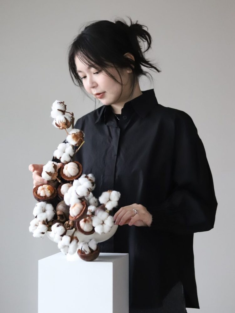 Eun Jin Yang is a skilled designer, floral sculptor and educator in Seoul, Korea. Yang hosts workshops for aspiring designers from around the globe, with the goal of floral education as well as cultural exchange. On top of her studio and educational endeavors, Yang crafts custom designs and installations for fashion photoshoots, experimenting with unconventional materials and techniques.