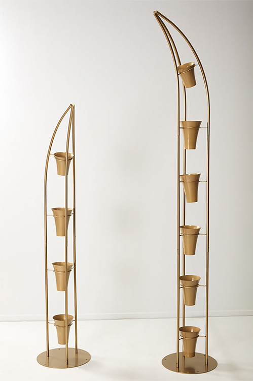 “These pieces are perfect for creating a dramatic impact while providing a water source for large floral installations,” says Woods. “When we were developing these products, with insights from Sue McLeary, we focused on solving the challenge of creating floating installations without using floral foam. Achieving height with a water source at the top is difficult, but these archways and stands make it possible.”
