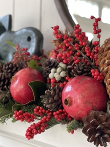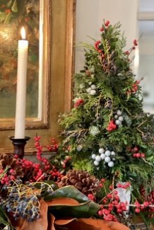 MG: What don’t we do with pine cones? We fill mantels solid with cones of different shapes, sizes and types; we lay evergreen branches on mantels and pick cones into the evergreens; we make wreaths with different sizes and types of cones; and we use them as place-card holders for dinner parties. The possibilities are infinite!