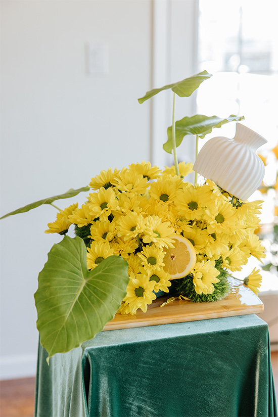 Cover the table with a non-patterned tablecloth or piece of fabric; I chose green velvet. Wrap the pots of the two “rose plants” in the same fabric (or a coordinating fabric) that covers the table, and then place the plants at the sides of the table. Next, artfully position the five tabletop arrangements on the table, with the calla-lily arrangement at the front right corner. “Garnish” the tabletop with papaya and lemon halves and Colocasia leaves—making sure to leave space for the table settings. Finally, place the larger calla-lily-and-carnation arrangement on the floor, at the front left corner of the table.