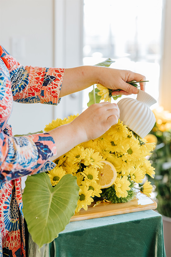 Remove the handle from a small floral-foam cage, and soak it in flower-food solution. Cut the lateral stems of ‘Champagne Yellow’ spray mum blooms, and arrange the blooms in a densely clustered mound. Next, skewer fresh lemon halves, and place them into the design. Then, cut six or so thin strips from a sheet of thin yellow craft foam, fashion them into “lemon-zest” curls with wire, and incorporate two or three into the design (Save the remaining curls for Piece 3.) Finally, place the finished arrangement atop an inverted ceramic compote container, and secure the floral-foam cage to the bottom of compote with adhesive dashes (or adhesive floral clay or hot glue). Arrange more flowers around the bottom of the design, as needed, to cover all the mechanics.